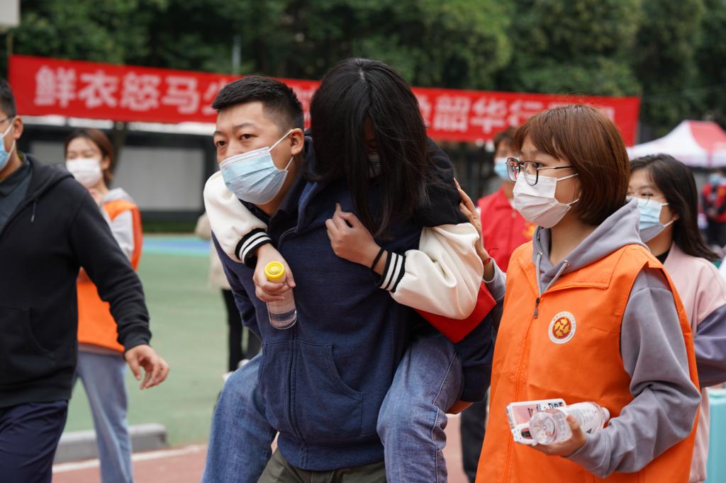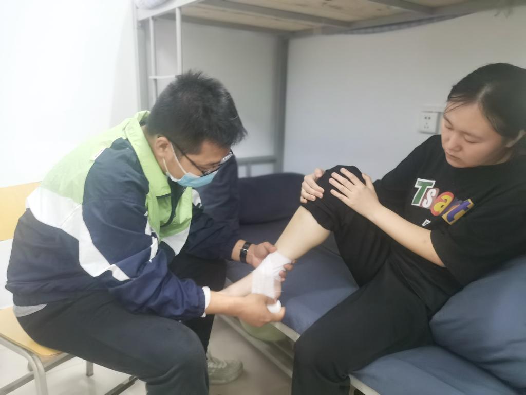 康复医学专业毕业的专班成员为受伤学生打绷带