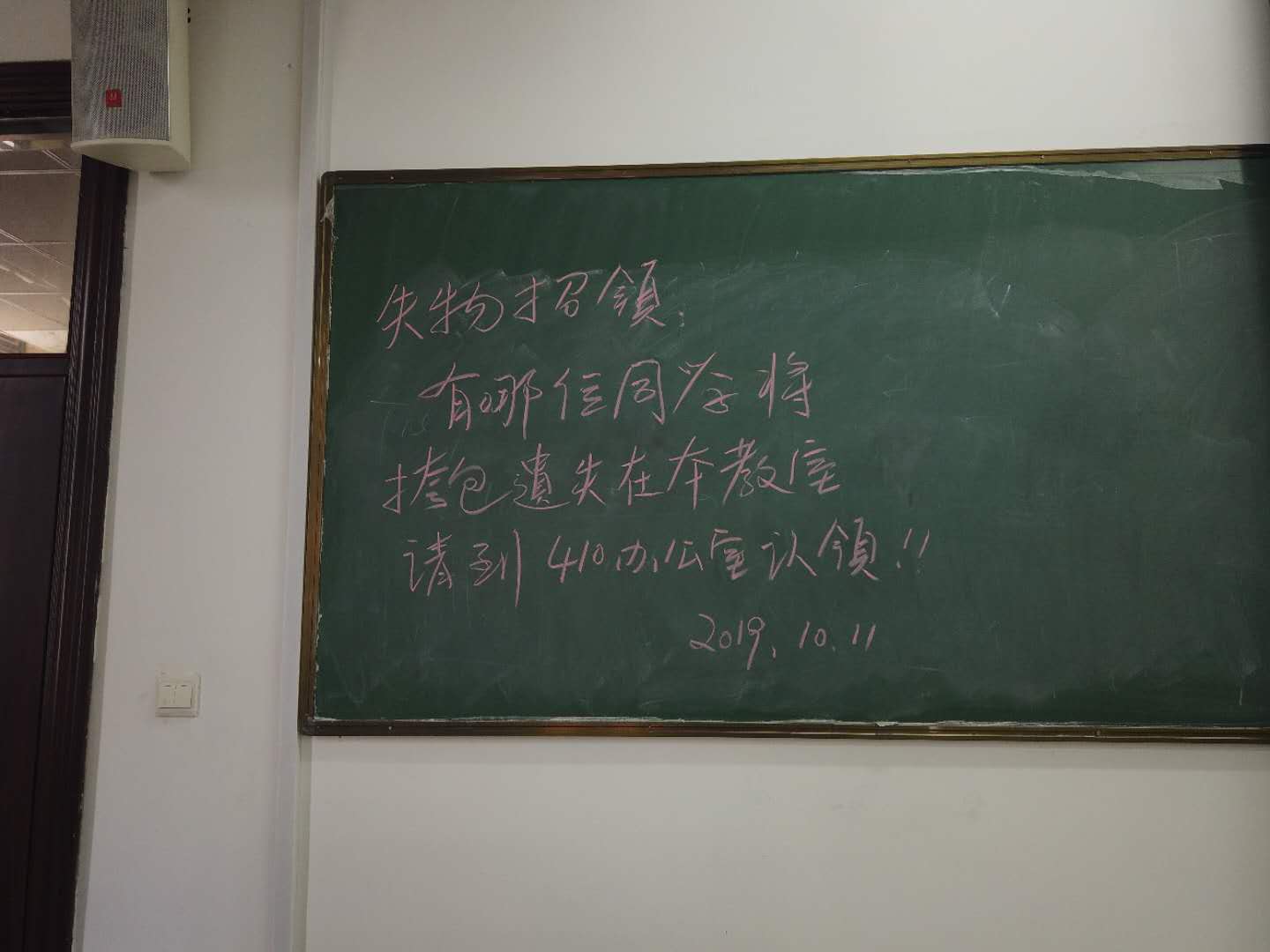 2019年10月11日上午,教学楼四楼保洁员魏小桃在打扫413合班教室时发现了一个书包。据魏小桃讲述,自己捡到书包后,在教室等待了半个小时,见无人回来寻找,便去联系了信息网络与大数据中心的王颖老师,并将失物交给了他。随后,王颖便在413合班教室的黑板上写下了失物招领的告示。失主看到告示后,很快回来认领。经过核实,书包内有钱包、钥匙与身份证等重要证件,失主对魏小桃表示十分的感谢,事后还说:要是没找到,自己回家都成问题。