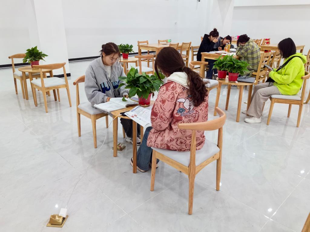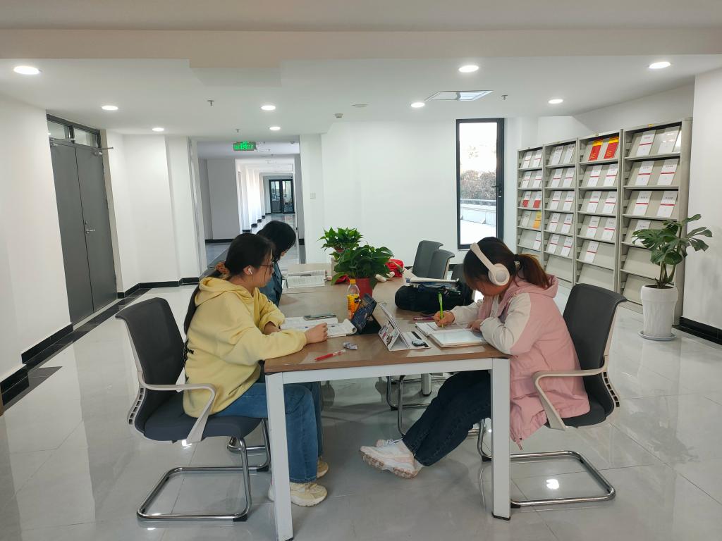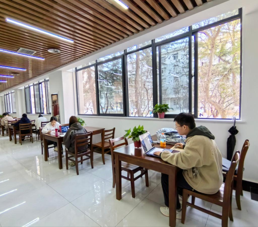 学生在装修好的图书馆内思考学习