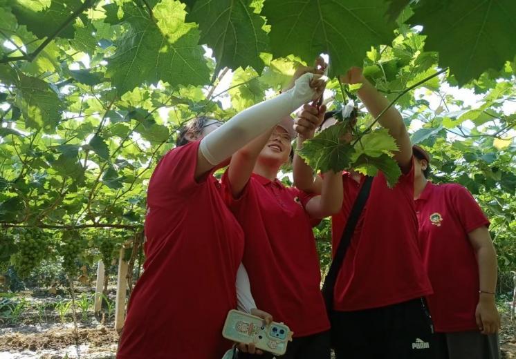 7月16日,团队一抵北市村,便按计划积极走访当地村干部和村民住户,深入了解近年来北市村的农业种植情况,探索农产品种类分布。葡萄满架延秋蔓,虬须拂面长,每一株即将成熟的葡萄都被褐色的防虫袋包裹着,这正是种植户辛勤劳作的成果。为了防止葡萄受到害虫的伤害和雨水的侵蚀,队员们在技术专家的指导下一边认真裁剪着枝叶一边仔细套上保护袋,一系列操作让团队深切感受到农民朋友们的勤劳与智慧。
