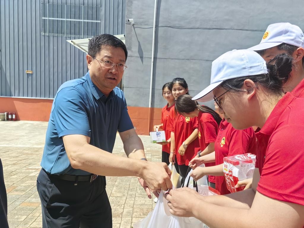 仪式结束后,张志华一行亲切慰问志愿者,为志愿者们送上消暑降温物品,详细询问了志愿者的吃、住、行以及社会实践活动开展情况,并悉心叮嘱志愿者实践期间要注意安全,牢记“奉献”是志愿者精神的精髓所在,鼓励志愿者们发扬吃苦耐劳精神,将专业知识运用到社会实践中,为乡村振贡献青春力量。随后,张志华带队走访调研了泾阳根社茯茶有限公司、元顺茶业有限公司,强化校企衔接、深化校企合作,拓宽学生实习就业平台。育人实践基地的建立为陕财职院暑期“三下乡”提供了更坚实广阔的实践平台,学校团委将以此为契机,利用基地的资源优势,引导广大学生在社会实践中受教育、长才干、做贡献,力求在助力乡村经济振兴等方面做出新的更大的贡献。