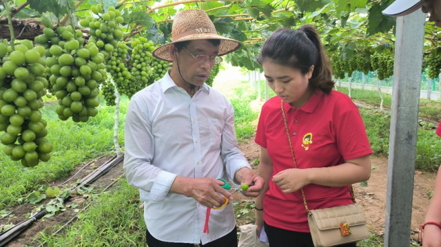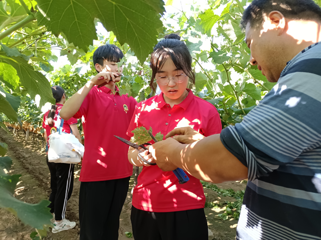图为队员学习修剪葡萄剪枝在田间劳作以及同农户们的交流中,先行队发现并了解到葡萄种植过程中存在果实瘪小、叶子发黄和斑点等问题,这制约着葡萄的品质和产量,影响着农户们的收益,束缚着当地乡村振兴的发展。先行队立即采取行动,经过多方协调沟通,成功联系到兴平市农技中心,并邀请技术专家实地指导。技术专家传授了毗邻地区类似案例经验,并结合现状提供了科学的应对方法,为解决当前种植难题提供了方法和思路,保障了当地葡萄种植产业稳定发展。