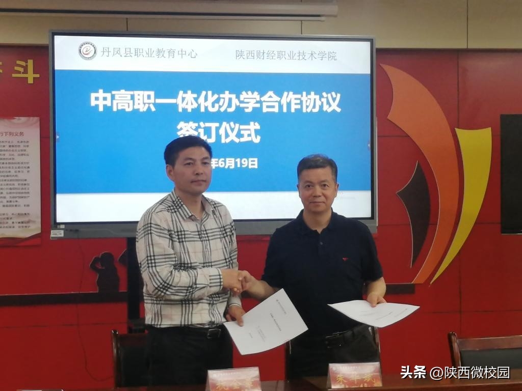 座谈结束后,朱华斌代表学校与丹凤职教中心签署了《中高职一体化办学合作协议》,张志华代表学校为丹凤职教中心授牌。