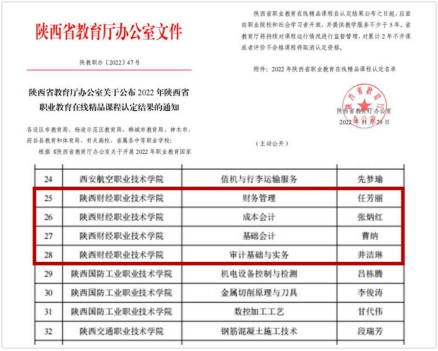 近日,陕西省教育厅办公室公布了《2022年陕西省职业教育在线精品课程认定结果的通知》(陕教职办〔2022〕47号),陕西财经职业技术学院申报的《财务管理》《成本会计》《基础会计》《审计基础与实务》4门课程被认定为省级在线精品课程,是该校历年来取得的最好成绩。