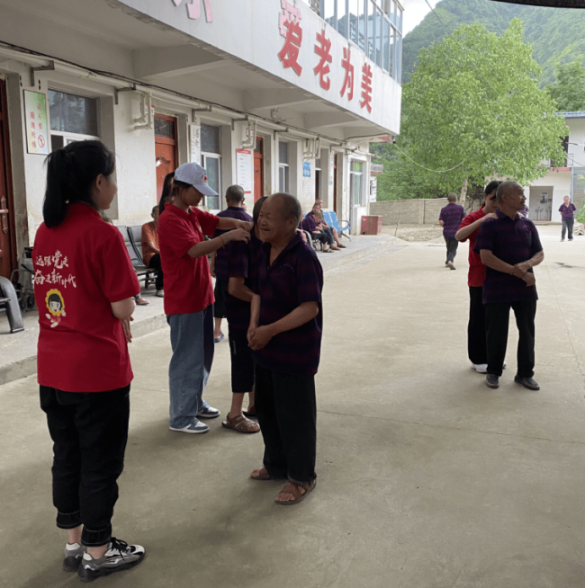早饭过后,在支教驻扎地安排好日常的教学及管理工作后,在祝老师的带领下,部分志愿者和小学生来到柞水县杏坪镇区域敬老院去看望孤寡残障老人,在敬老院看护人员协助下,和老人在敬老院院子里聊天、散步、捶背,起初有些老人在大家面前还显得很拘谨,但个别活跃性格开朗外向的学生十分热情带动了大家。有的老人行动不便,志愿者便一路搀扶陪伴,边走边聊,老人们的舒心一笑就是对志愿者最大的鼓励。
