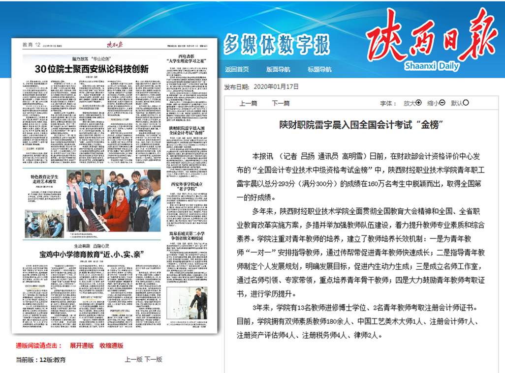 本报讯 (记者 吕扬 通讯员 高明雪)日前,在财政部会计资格评价中心发布的“全国会计专业技术中级资格考试金榜”中,陕西财经职业技术学院青年职工雷宇晨以总分293分(满分300分)的成绩在160万名考生中脱颖而出,取得全国第一的好成绩。