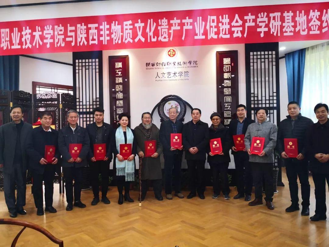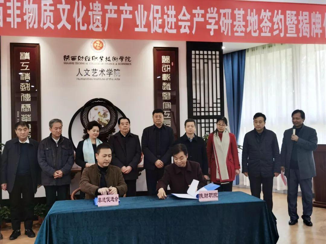 2019年12月11日,古都咸阳。由陕西省非物质文化遗产产业促进会、陕西财经职业技术学院联合举办,陕财职院人文艺术学院承办的“非遗产学研基地”签约揭牌仪式隆重召开,学院党委书记张志华、袁红会长及来自全省的非遗传承人、工艺美术大师、非遗企业代表和新闻媒体约五十余位嘉宾莅临见证此次活动。