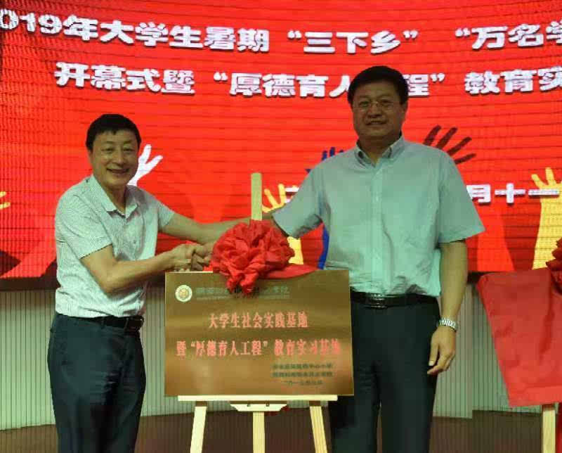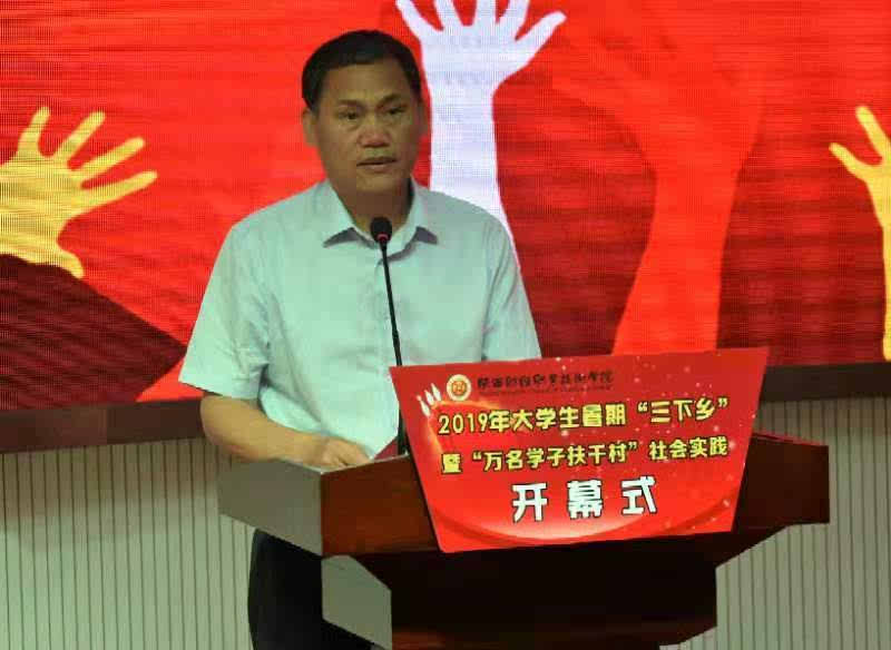 7月11日上午10:00, 陕财职院在商洛市柞水县城区第一小学多功能厅举办了2019年大学生暑期“三下乡”“万名学子扶千村”社会实践开幕式暨“厚德育人工程”教育实习基地揭牌仪式。出席活动的领导有陕财职院党委书记张志华、院长程书强、副院长刘晓玉,柞水县科技和教育体育局局长傅先亮、副局长陈友谊。 陕财职院党政办主任宋波,学工部部长、学生处处长雷旭,各承办单位负责人,各队指导老师,柞水县各乡镇、学校领导,帮扶对象代表,以及三十支志愿服务队师生志愿者代表共计200余人。凤凰镇、小岭镇、杏坪镇、石瓮镇的155名师生志愿者已于10日到达帮扶点展开志愿服务工作。